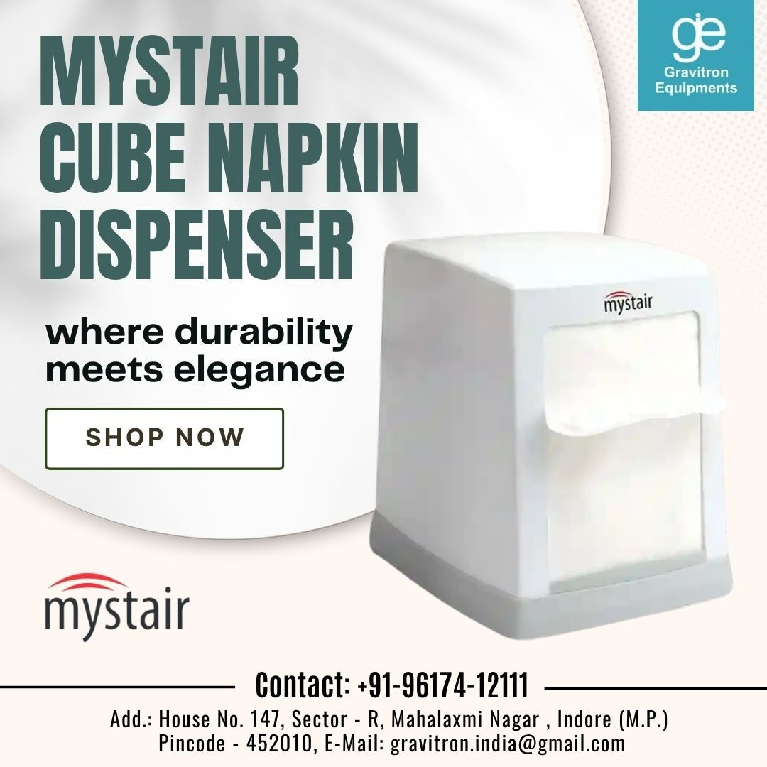 Mystair Cube Napkin Dispenser Distributor in Indore Gravitron Equipments in Indore is a trusted distributor of Mystair Cube Napkin Dispensers, offering high-quality and stylish hygiene solutions for offices, restaurants, hotels, and commercial spaces. Designed for convenience and durability, the Mystair Cube Napkin Dispenser ensures easy dispensing, reduced wastage, and improved hygiene. Gravitron Equipments provides genuine Mystair products known for their sleek design, robust build, and user-friendly functionality. With a focus on quality, customer satisfaction, and timely delivery, the company has become a preferred choice for hygiene and washroom accessories in Indore. Whether you are setting up a new business space or upgrading your existing facilities, Gravitron Equipments offers reliable and affordable solutions to enhance your hygiene standards. Backed by professional service and product expertise, they ensure every client receives the best-in-class dispenser systems.